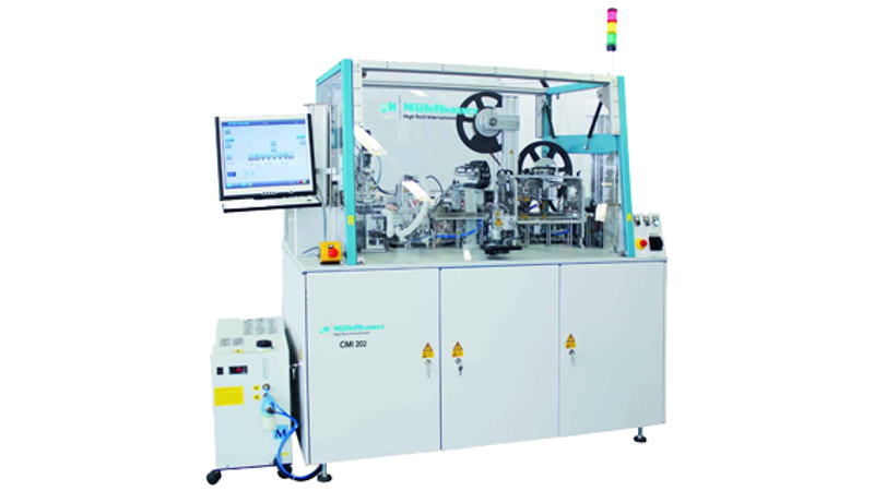 Dieser Prozessschritt vereint zwei wesentliche Bestandteile der Chipkartenproduktion in einer Anlage. In die Kartenkörper werden Vertiefungen gefräst, die entsprechend der Größe des zu implantierenden Moduls bemessen sind. Die IC-Module werden aus dem Tape ausgestanzt, bevor sie in die Vertiefung eingesetzt und fixiert werden. Dabei sorgt das Hotmelt-Band für die Haftung des Moduls in der Vertiefung, während der Flexible Bump eine dauerhafte Verbindung garantiert.